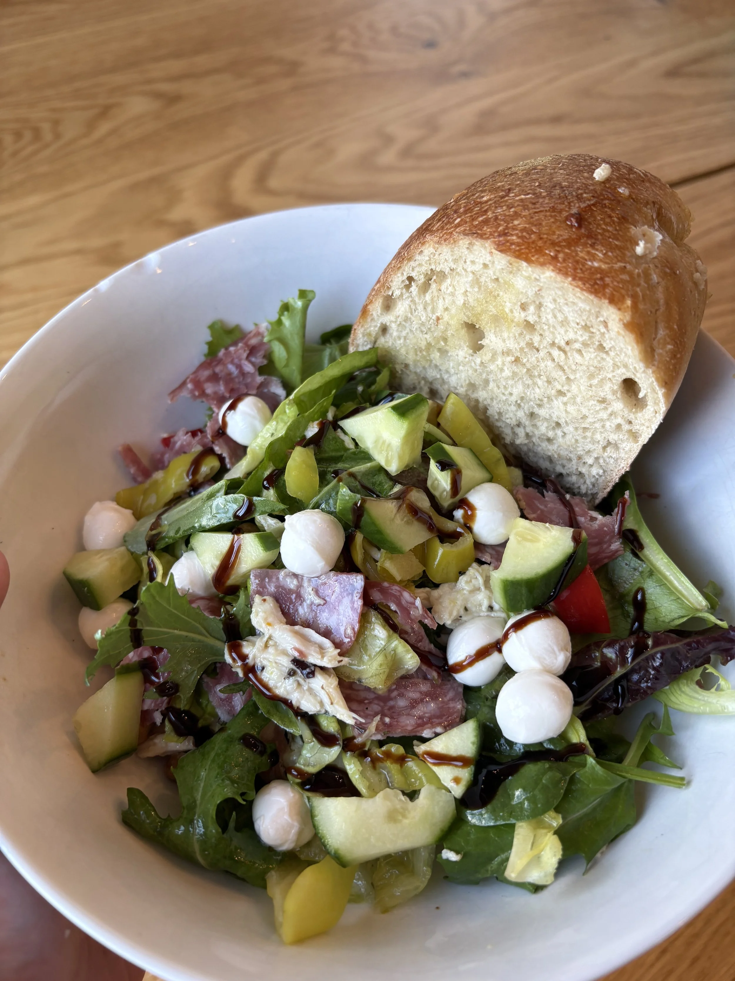 It’s packed with the good stuff — salami, fresh mozzarella, butter lettuce (which I really recommend — it’s soft but still crisp), cucumber, red pepper, and some roasted chickpeas for crunch. I usually add shredded chicken or turkey, but you can swap that out or skip the meat if you want. Peppericini give it a nice little kick too.