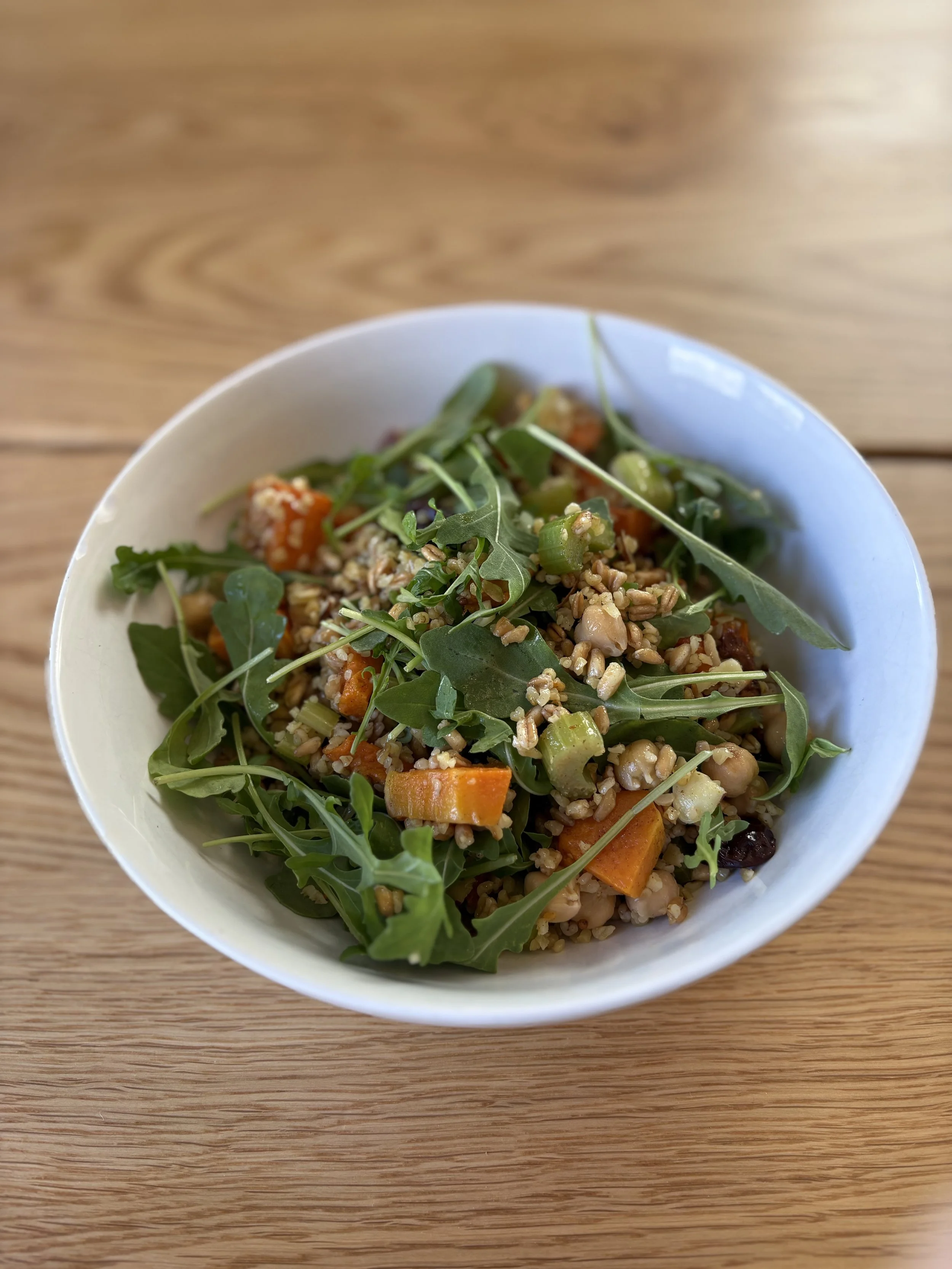 You all know I love a good salad, and this one might just be my favorite fall combo yet. It’s got all the cozy, seasonal flavors of autumn: chewy farro, roasted butternut squash, a little sweetness from dried cherries, and some crunch from pumpkin seeds and celery.